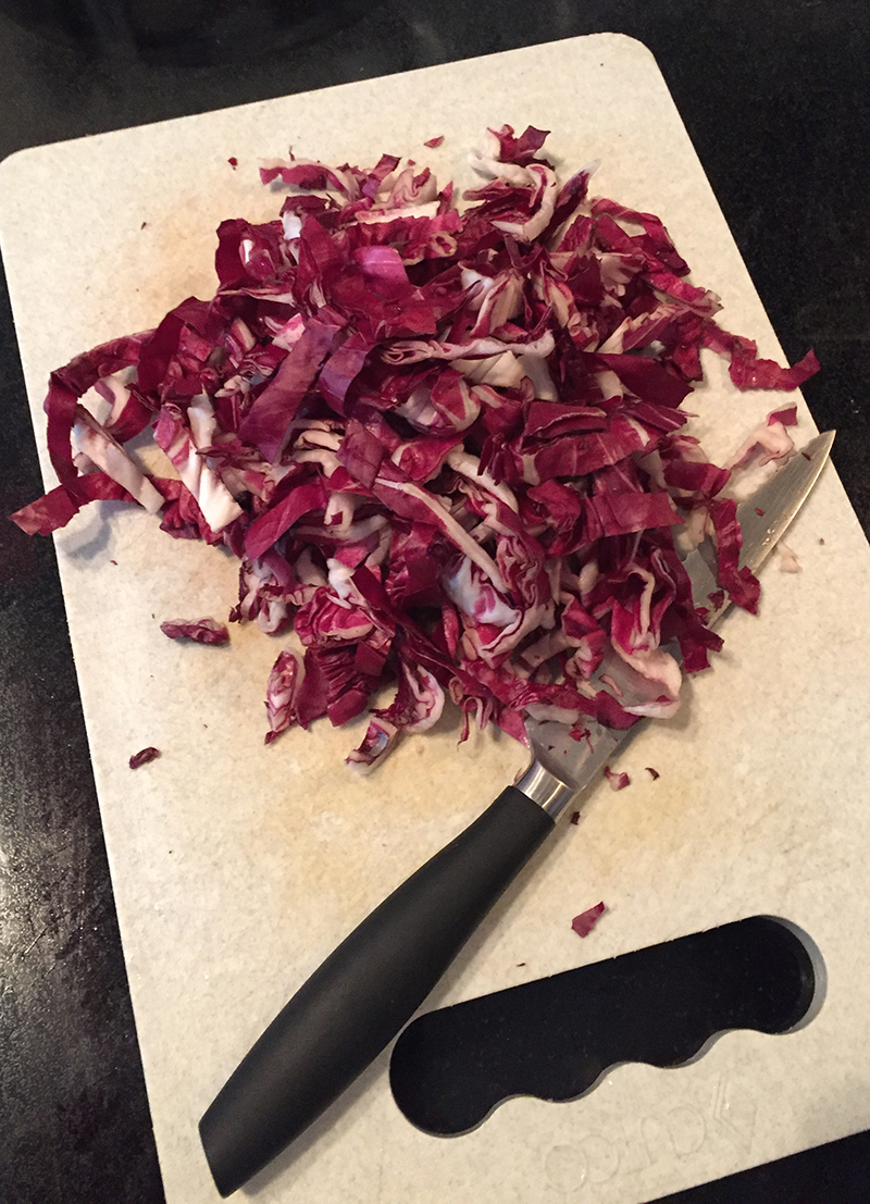 Mélanger le radicchio au jus + huile d’olive + échalote.