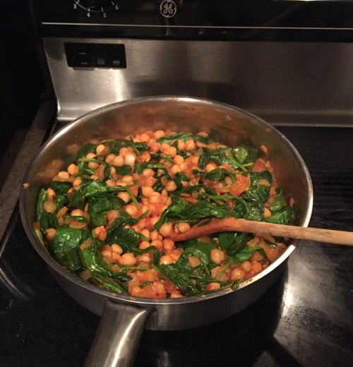 1. Les pois-chiches aux épinards: 1 boîte de pois-chiches égouttés, 1 oignon coupé finement, de l’huile d’olive, 3 gousses d’ail coupées finement, de la poudre de cumin, un peu de piment séché (si on veut), sel et poivre, 5 grosses poignées d’épinards frais, 2 cuillères à soupe de concentré de tomates, 1 peu d’eau ou de bouillon de légumes.