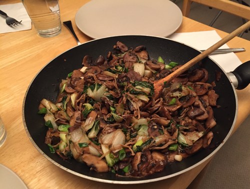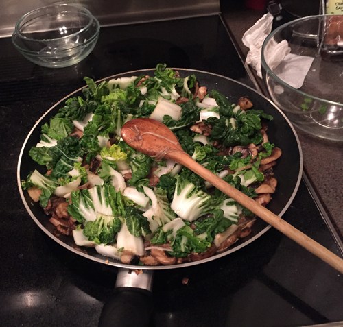 2. Champignons aux bok choy: 500g de champignons multiples et variés (shiitake, etc.) coupés en tranches, 1kg de bok choy coupé en lamelles d’environ 2 cm, de l’huile, de la sauce de soja, de l’huile de sésame, quelques piments frais ou séchés (si on veut), 5 gousses d’ail finement coupées, 1 cuillère à soupe de gingembre râpé, 1 petite cuillère de sucre, quelques petits oignons (scallions) coupés finement, sel et poivre.