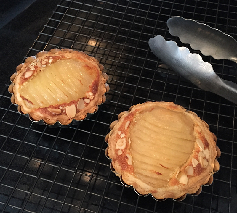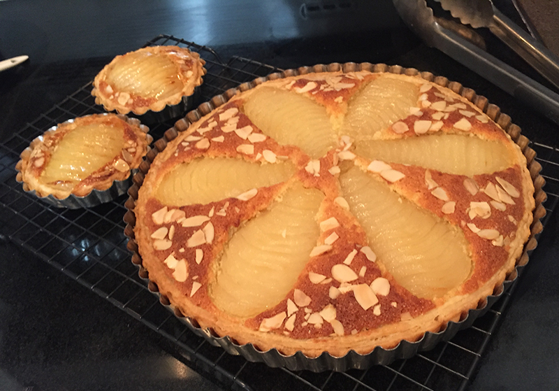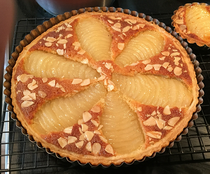 - Etaler la pâte au fond du moule (avec mes proportions, j’avais assez de pâte, de poires, et de crème d’amande pour deux petites tartelettes de plus). Etaler la crème d’amande dessus. Déposer joliment les poires sur la crème d’amande (regarder une vidéo sur YouTube pour apprendre la technique). Décorer avec quelques amandes effilées. Enfourner à 180ºC/350ºF pour 30-40 minutes.