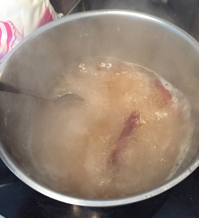 - Pocher 4 poires épluchées dans de l’eau + sucre + 2 bâtons de cannelle + gousse de vanille pendant 5-15 minutes (ça dépend de si elles sont mûres ou pas). Couper les poires (refroidies) en fines tranches dans le sens de la largeur. Faire réduire le liquide 30-40 minutes jusqu’à avoir un sirop.