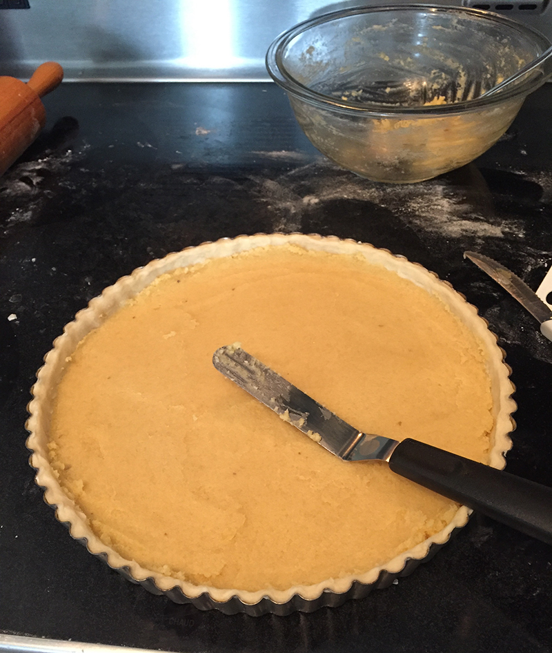 - Faire une pâte sucrée avec 210g de farine, 120g de beurre, 1 pincée de sel, 40g de sucre, et un peu d’eau.