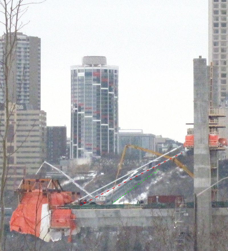 Nan, mais franchement, tu trouves ça normal que : l’angle (rouge) du premier cable du pont du métro ne soit pas exactement le même que l’angle (vert) du téléphérique qui descend la colline juste derrière?!