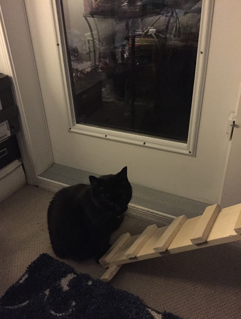 Vous vous souvenez de la petite échelle que j’avais construite en décembre pour Calinette? Calinette est monté dans son arbre à chat seulement deux ou trois fois depuis, et à chaque fois, il fallait que je sois avec elle pour l’aider à descendre de l’arbre sur cette petite échelle en cliquant de l’ongle sur les marches pour qu’elle arrive à les trouver. A chaque fois qu’elle était bien descendue, je lui donnais quelques gâteries pour la récompenser de ses prouesses.