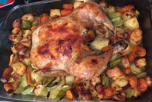 Je n’avais jamais fait de poulet rôti auparavant parce que ça me semblait trop compliqué, trop long, et trop à manger pour moi toute seule. Mais le copain qui m’a suggéré d’essayer vit seul aussi et m’a convaincu qu’en trois jours j’aurais tout mangé, et que c’était bien moins cher et bien meilleur que de manger ces blancs de poulet individuels, sans goût et secs. Il avait raison!