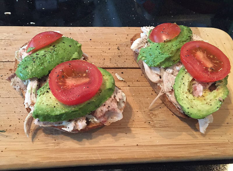 • Le troisième jour, retirer toute la viande restante sur les os et en faire de délicieuses tartines (pain grillé, mayonnaise, poulet, sel-poivre, avocat, et tomates).