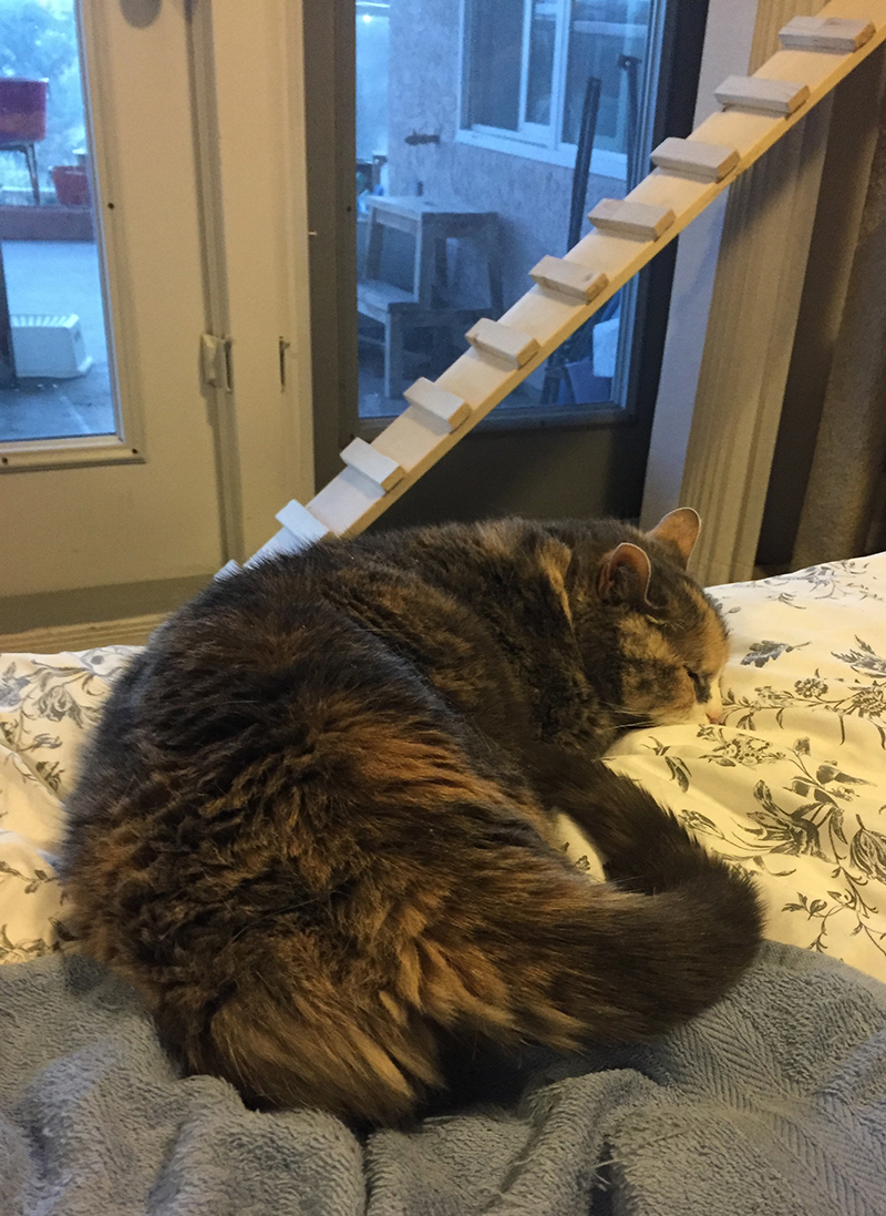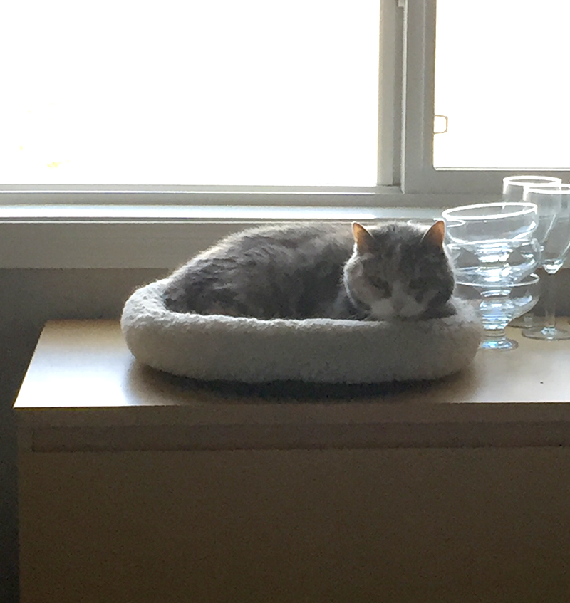 Le 2ème jour, Miss Penny a découvert la chambre d’amis et le balcon, et est tombée amoureuse du petit lit de chat sur la commode. C’est là qu’elle a dormi pendant la première journée et la première nuit. Elle a commencé à accepter les gratouilles derrière les oreilles et sur le crâne, et les bisous sur la tête, mais pas encore les caresses.