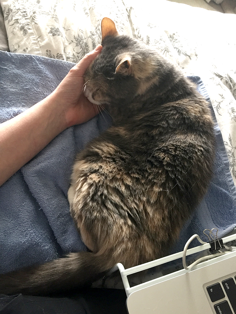 Aujourd’hui, cinquième jour, Miss Penny est venue en fin d’après-midi à côté de moi, et après de très longues délibérations, elle a posé sa patte et sa petite tête dans ma main pour y dormir quelques minutes! Le soir, j’étais dans la cuisine, et elle m’a très clairement fait comprendre que je devais être avec elle sur le lit! Là! Maintenant!