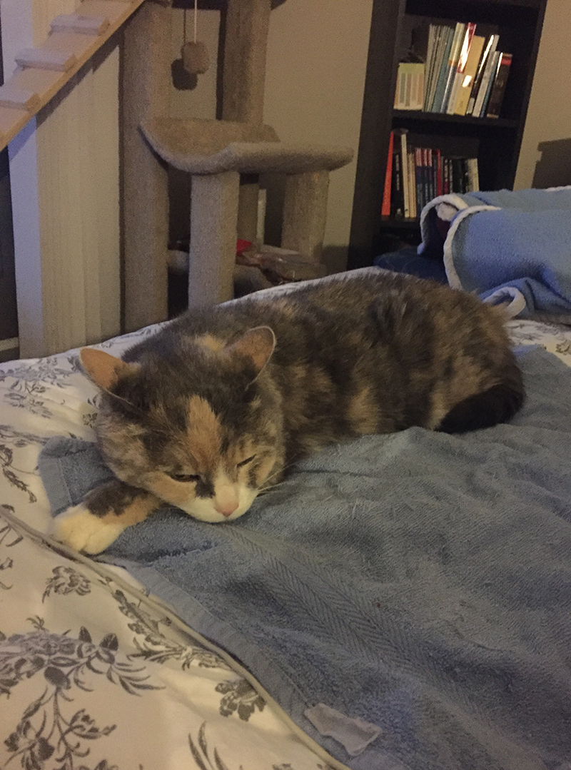 Aujourd’hui, cinquième jour, Miss Penny est venue en fin d’après-midi à côté de moi, et après de très longues délibérations, elle a posé sa patte et sa petite tête dans ma main pour y dormir quelques minutes! Le soir, j’étais dans la cuisine, et elle m’a très clairement fait comprendre que je devais être avec elle sur le lit! Là! Maintenant!