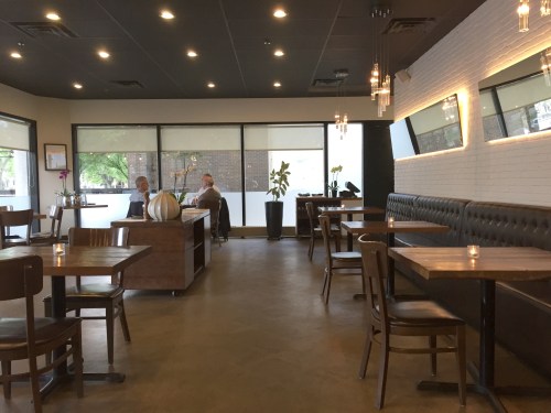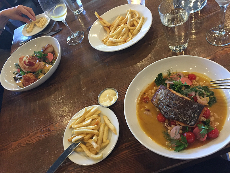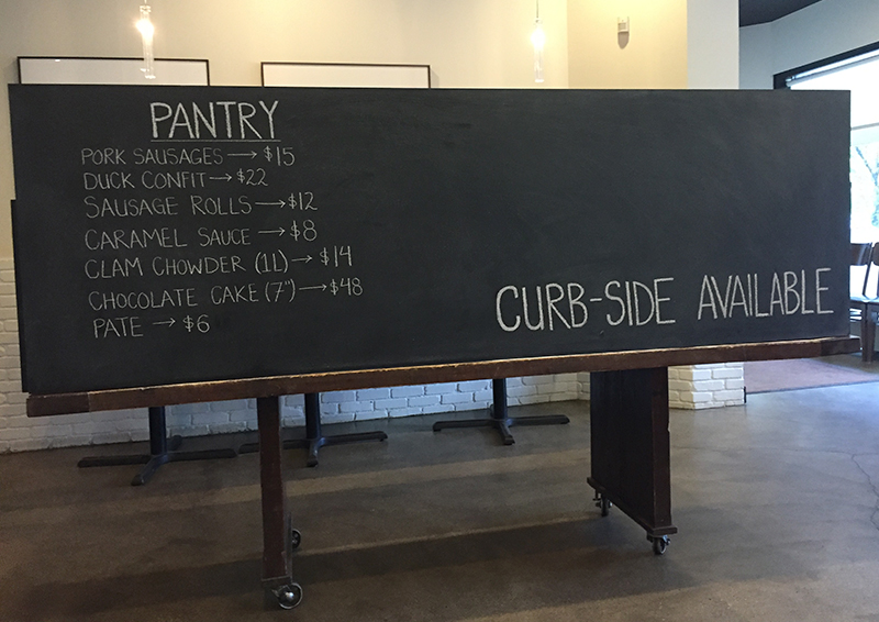 Tout était comme avant et rien n’était comme avant. Plus de la moitié des tables avaient disparu (“ma” table attitrée inclue), il y avait une table à l’entrée avec du désinfectant, il y avait une énorme ardoise indiquant les pantry items disponibles et qu’on pouvait encore commander des repas en “curb-side,” les serveurs portaient des masques, il n’y avait plus de pain et de beurre posés sur la table dès notre arrivée, et l’ardoise des specials n’avait aucun specials dessus, mais je me suis tout de suite sentie de nouveau chez moi.