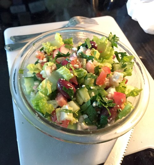 Salade préférée de cet été: romaine, olives, feta, échalote, tomates, persil, concombre, radis (parce que le mec qui m’a fait les courses dimanche m’a pris deux bottes de radis par erreur).