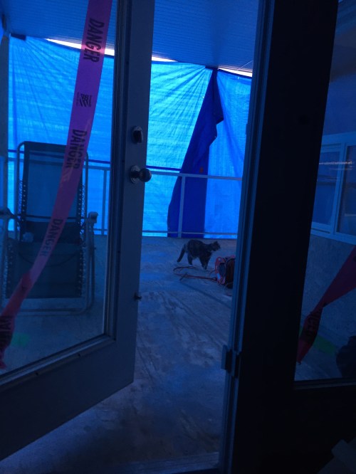 Après une semaine de tempêtes de vent et de folie, la toile s’est déchirée par endroit, et grâce à quelques coups de ciseaux bien placés (ne le dites à personne), j’ai pu revoir un peu de lumière et essayer de dormir à nouveau: