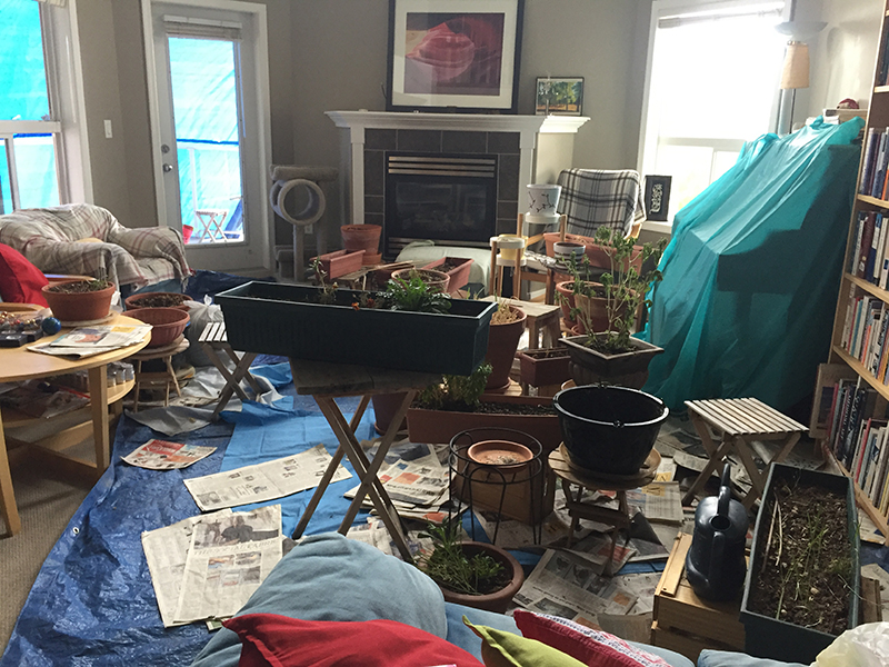 Et puis tous les cosmos qui étaient prêts à fleurir n’ont finalement pas fleuri et tout a dépérit, à cause du manque de lumière et d’air, et plein de petites bêtes diverses et variées sont apparues dans les pots et sur les plantes et sur mon canapé et j’en ai eu vraiment trop marre du bordel, de l’odeur, du chenit, de tout, et j’ai commencé à tout couper: