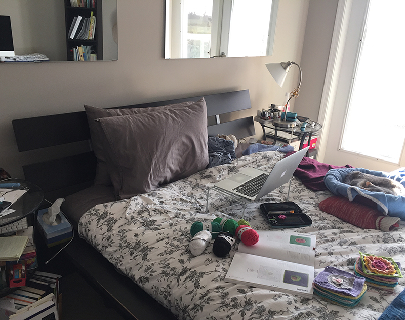 Le soir, je passe à mon troisième bureau, sur mon lit, et là Miss Penny est à nouveau heureuse parce qu’elle peut venir quémander un petit bisou de temps en temps et dormir dans son petit lit en gardant un oeil sur moi. Par contre, mon ordinateur est aussi vieux qu’Angela Lansbury et a une épaisse ligne noire à gauche sur l’écran, donc je l’utilise pour lire mes emails, regarder la météo du lendemain, jouer à des petits jeux de cartes, écrire sur mon blog, regarder les dernières statistiques du covid, vérifier que mes employé.e.s travaillent bien, tchatcher sur FaceTime et WhatsApp avec les copines et la famille, regarder des vidéos sur les points de crochet, et lire le New York Times, mais c’est à peu près tout. C’est à ce “bureau” que je passe mes soirées, soit à travaillotter sur mon ordinateur, soit à regarder des séries débiles, soit à crocheter des pastèques en écoutant mes bouquins audio, soit les trois à la fois.