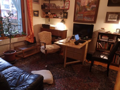 Ici je n’ai qu’un ordi portable qui se ballade avec moi. Parfois (rarement) je le connecte dans le bureau à un écran plus grand, sinon il est sur la table de la salle à manger ou sur la table dans ma salle de classe (tant que le COVID ne npus oblige pas à refermer).
