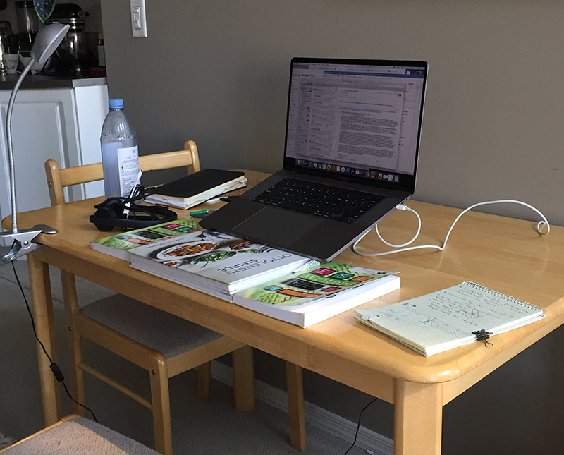 Ensuite, l’après-midi, mon bureau est dans mon salon, sur la table à manger, avec le meilleur ordinateur de la maison qui me permet de ne pas me tuer ni le dos ni les yeux ni les poignets grâce à un large écran, un petit bidule collé dessous qui permet de le surélever à souhait, et le bouquin de recettes d’Ottorino Respighi (qui m’est enfin utile). Là, Miss Penny ne peut pas m’observer, alors elle boude et monte dans son loft et y reste planquée à m’ignorer et je suis très triste parce qu’elle me manque beaucoup! C’est à ce bureau que j’enseigne mon cours et assiste à toutes mes réunions zoomesques. Ma “chaise de bureau” (achetée avec la table à manger chez JCPenny en 1998 à Provo en Utah et avec laquelle j’ai déjà eu quelques mésaventures) n’est pas du tout confortable, donc après quelques heures, j’ai super mal aux hanches, ce qui explique pourquoi je n’y reste pas toute la journée!