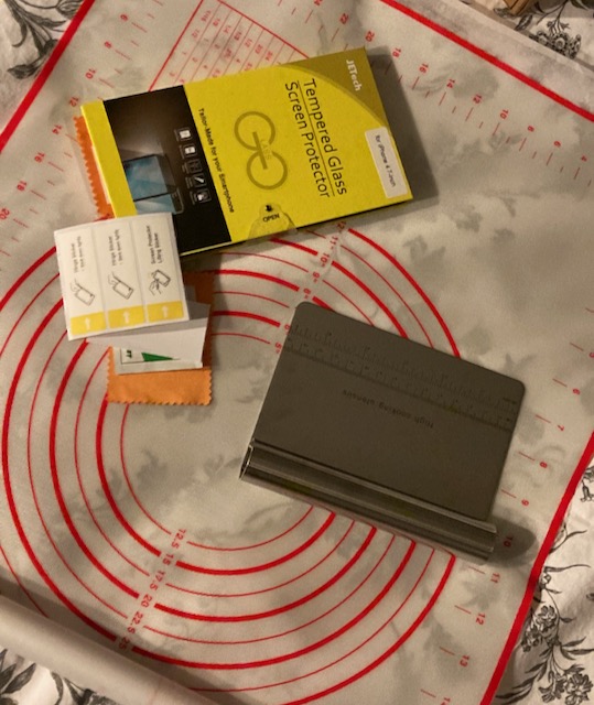 C’était chouette de trouver enfin assez de trucs à acheter pour ne pas devoir payer les frais de port! J’ai acheté: des petits trucs pour “fermer” la vidéo de mon écran d’ordinateur (le scotch électrique c’est pas génial); un truc pour protéger mon écran de téléphone, parce que ma nouvelle “chemise de téléphone” est très lisse et donc mon téléphone tombe tout le temps partout; un nouveau truc en silicone pour étaler ma pâte dessus, et cette fois-ci c’était bien ce que je voulais; et un truc pour couper la pâte, dough scraper, je sais pas ce que c’est en français. Je voulais aussi un joli dôme en verre pour protéger mes gâteaux et les empêcher de sécher, mais j’essaye de vider ma baraque en ce moment, pas de la remplir d’encore plus de trucs sans lesquels je vis très bien (bon OK le dough scraper n’était pas une nécessité mais j’en rêvais depuis longtemps et il a coûté $11 et le dôme à gâteau aurait coûté $160, donc j’ai fait $149 d’économie finalement).
