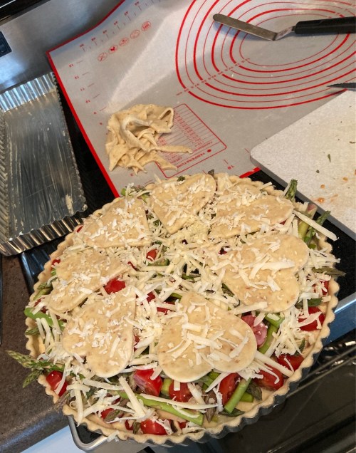 J’ai rajouté de la pancetta grillée dans ma deuxième quiche aux tomates cerises et asperges et c’était une mauvaise idée! Et le 50/50 crème et lait n’était pas non plus une bonne idée.