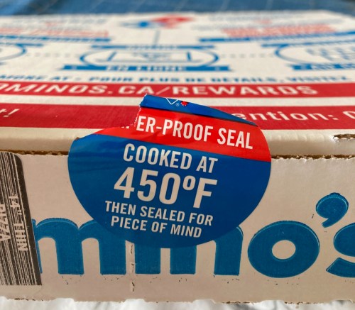 Ca m’a fait rigoler de: voir un autocollant sur la boîte à pizza avec une superbe erreur: piece of mind, au lieu de peace of mind!