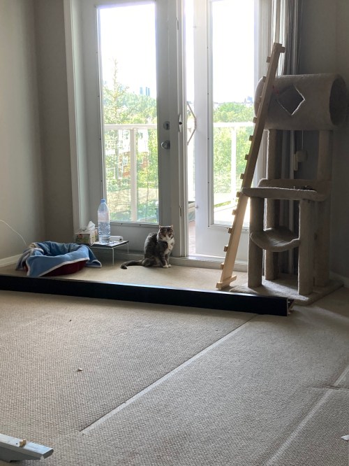 Hélas, elle n’a plus l’arbre à chat, mais le reste est toujours là effectivement 🙂 Le balcon n’est plus très intéressant parce que je ne peux plus y passer de temps, alors elle y va moins. Mes affaires devraient arriver 2 semaines après mon arrivée à Kingston, et j’espère survivre à ces 2 semaines…