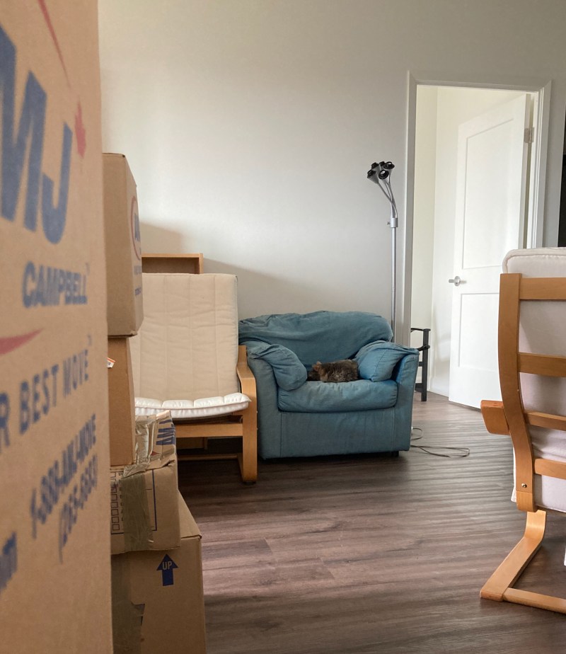 Mercredi matin, alors que j’aurais dû être en train de participer à une “orientation pour les nouveaux profs” au boulot, les déménageurs sont arrivés chez moi! J’ai enfermé la pauvre Miss Penny sur le balcon au début, et puis une fois qu’un fauteuil est arrivé dans le salon elle s’y est installée et n’en a plus bougé de la journée!