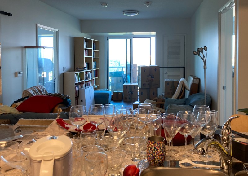 • Pas d’aide avant quelques semaines, non, mais je défais un carton par jour environ, donc je devrais avoir terminé dans… quelques semaines 🙂 Mais il y a beaucoup de choses que je ne peux pas faire, comme monter ma table à manger, accrocher mes tableaux et le rideau de baignoire, etc. Ce soir j’ai mis mes 58 verres dans leur armoire, ça ne m’a pris que 26 trajets exactement entre le comptoir de la cuisine et l’armoire en question, hehe!