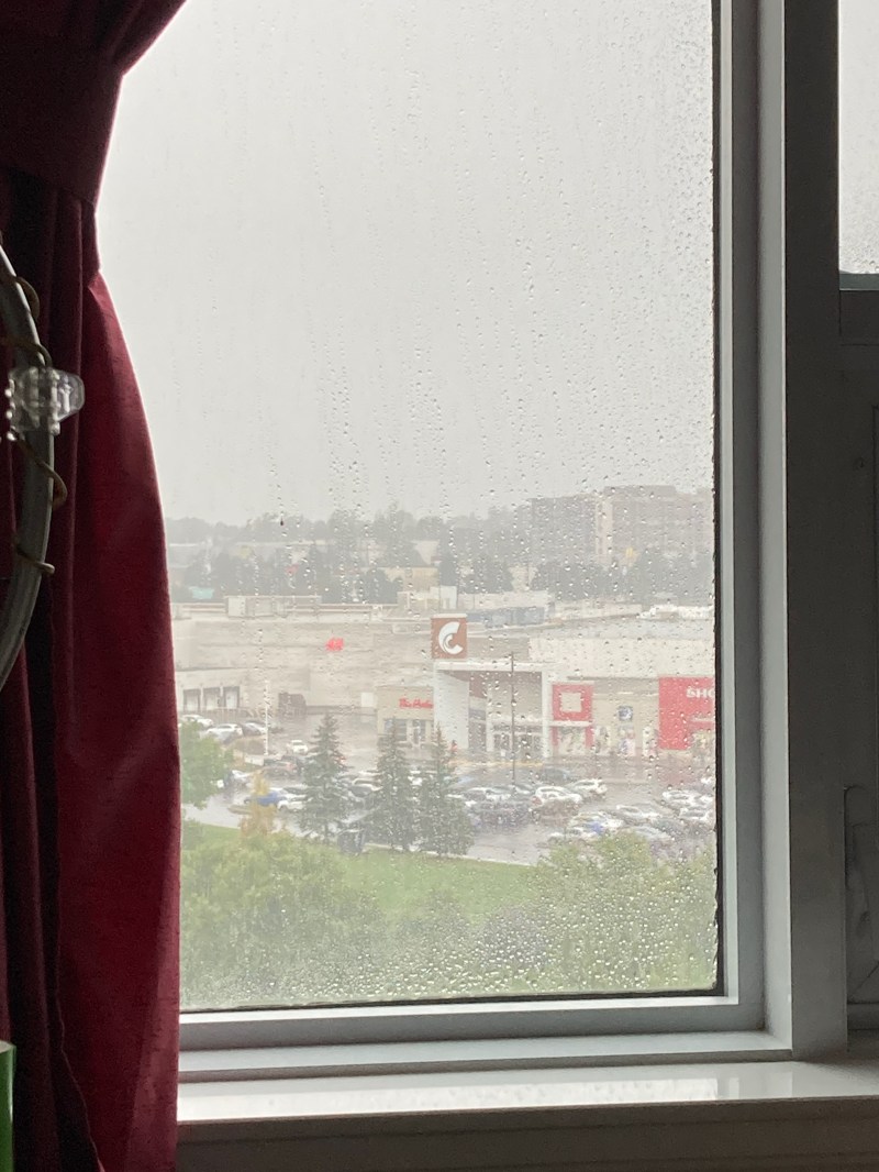 L’un des trucs que je déteste dans mon appartement c’est que je n’entends pas la pluie, sauf si c’est une pluie vraiment diluvienne et que le vent fait que la pluie tombe dans le sens de mes fenêtres, ce qui est très rare. En Alberta, il pleuvait rarement (on avait surtout de la neige), mais j’aimais beaucoup le bruit de la pluie sur le toit, et puis j’aimais le bruit des dernières gouttes tombant dans les gouttières verticales le long de l’immeuble.