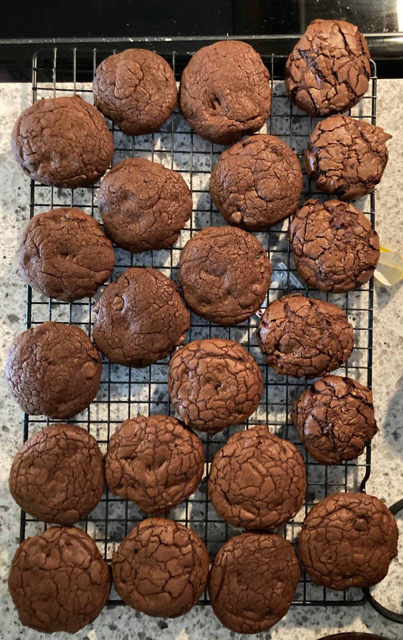 Ma tante m’a appelée quand j’étais en train de finir de faire fondre le chocolat/beurre, donc le mélange a figé et c’était très merdique de tout mélanger ensemble et ils ne s’étalaient pas, j’ai dû les aplatir moi-même après quelques minutes dans le four. Ensuite, les 12 minutes étaient trop longues because mon four est visiblement hyper long à chauffer mais ensuite il est hyper plus chaud que mon ancien four donc mes cookies étaient trop cuits. C’est bon à savoir (soupir)…