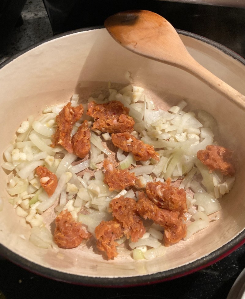 Il suffit de faire revenir oignon/ail pendant quelques minutes pour qu’ils soient transparents, et puis ajouter la saucisse et la laisser griller un peu avant d’ajouter tout le reste 🙂