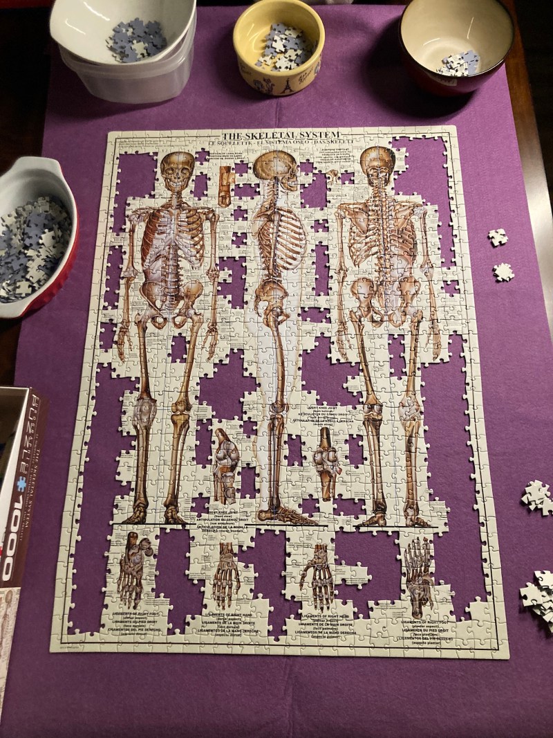 Le cerveau déconnecté, c’est peut-être un symptôme de la Covid? J’ai vaguement une idée pour le muscle poplité, le ligamant machinohuméral et le vastus latéralis (un copain du grand droit, je crois). Mais j’ai déjà fort à faire avec mon puzzle, que tu m’as encouragée à ressortir (il faut que je raconte ça)…