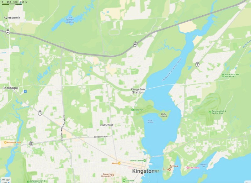 Bref, en décembre 2019, Kingston a commencé à construire un troisième pont, le Third Crossing comme ils l’ont appelé, qui n’apparait que sur la carte ci-dessous, en gris tout léger. Vous le voyez, à droite de la Kingston Station?