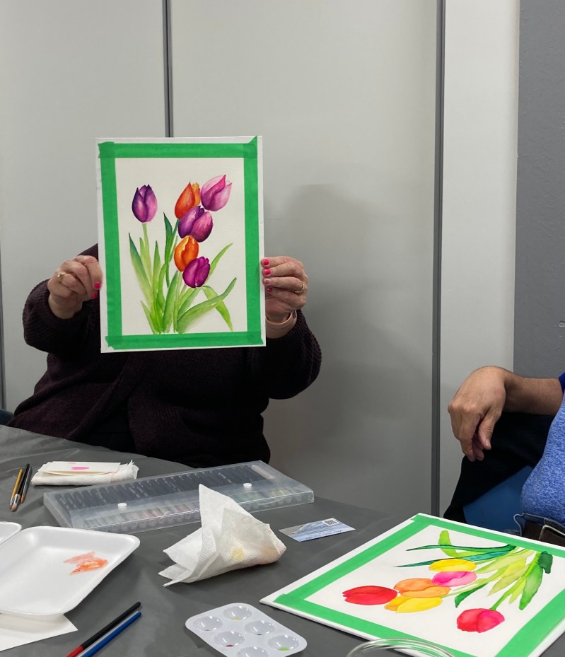 Quand j’ai pris le cours de print making cet hiver, je l’ai fait comme un défi parce que je ne suis vraiment pas créative et que je déteste tout ce qui est dessin et peinture. Je me suis aussi dit qu’à 50 ans, il était temps de faire quelque chose de nouveau. Finalement, j’ai été misérable et j’ai détesté tout ce que j’ai fait pendant tous les cours sauf le dernier, quand j’ai appris une technique qui s’appelle intaglio en anglais, peut-être parce que je n’avais pas besoin d’être créative. Bref, récemment, quand j’ai vu un cours d’aquarelle proposé par The Tett Centre for Creativity and Learning, je m’y suis inscrite. Et le cours d’hier soir était très sympa, sauf que je n’aime pas du tout mes tulipes (photo ci-dessous), mais j’ai retrouvé ce repos de cerveau et ce plaisir de “juste copier.”