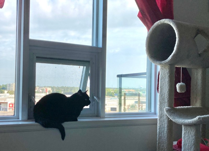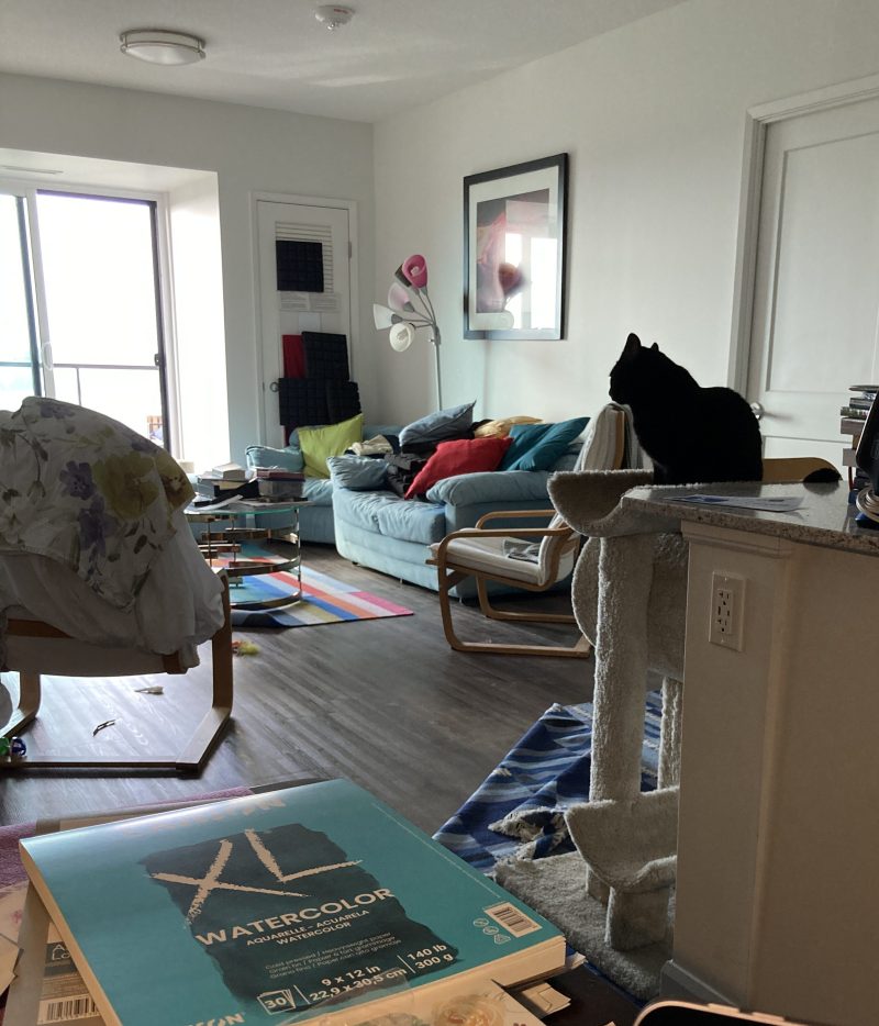 Cela fait maintenant presque deux semaines qu’elle est “rentrée” ici, après mon retour de voyage, et j’ai été soulagée de voir qu’elle semblait bien se souvenir de l’appartement. Elle était toujours aussi anxieuse et méfiante et a passé plus d’une semaine derrière mon lit la plupart du temps, mais elle en sortait pour aller manger et faire ses besoins, et allait se balader pendant la nuit, même si elle ne jouait pas encore comme avant notre séparation.