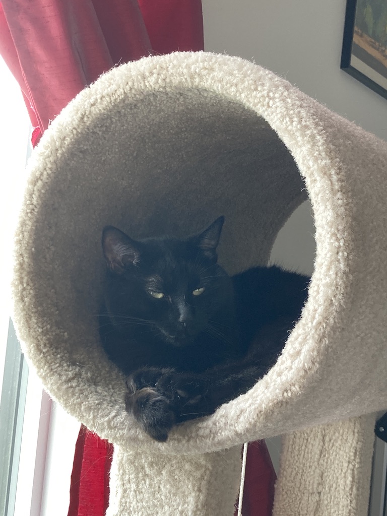Maintenant, elle passe la plupart du temps dans l’arbre à chat dans ma chambre et elle vient même manger ses repas avec moi le soir et le matin, dans la cuisine, même si elle repart en courant si je bouge trop ou si elle entend du bruit dans le couloir… mais elle revient de plus en plus rapidement. Pendant la journée, quand elle se réveille, elle vient parfois me faire un petit coucou très rapide avant de retourner pioncer dans son arbre. Elle reste même parfois dans l’arbre à chat de la cuisine ou sur le comptoir (où je lui laisse souvent des petites gâteries) à m’observer, quand je fais de la peinture. Et depuis deux jours, elle a aussi recommencé à me demander de jouer avec elle avec le petit laser qui la fait courir dans tous les sens!