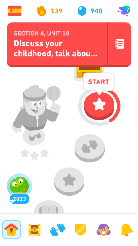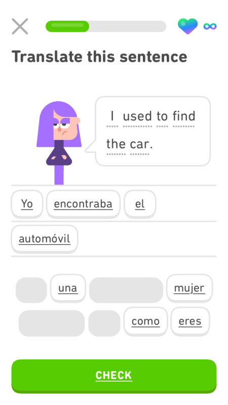 Moi, je déteste ce système de gamification, et je ne trouve pas les unités (puisqu’il n’y a pas de “leçon”) très bien organisées ni toujours très utiles (évidemment, c’est l’intelligence artificielle qui décide de tout). Les révisions de vocabulaire sont souvent très nulles, et les exercices pas toujours bien pensés. Par exemple il est difficile d’apprendre les articles masculins et féminins des noms, en espagnol, mais les exercices de vocabulaire n’utilisent que rarement les articles. De plus, les exemples donnés sont parfois vraiment nuls, du genre “mon cheval était en train de faire à manger quand je suis entrée dans la cuisine.” Ca fait peut-être rire les jeunes.